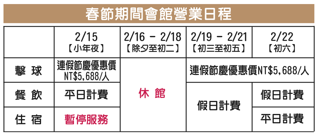 感謝您今年對揚昇的支持與愛護!本俱樂部自2月16日(除夕)至2月18日(初二)休館三日,期間住宿、餐飲以及擊球皆暫停服務