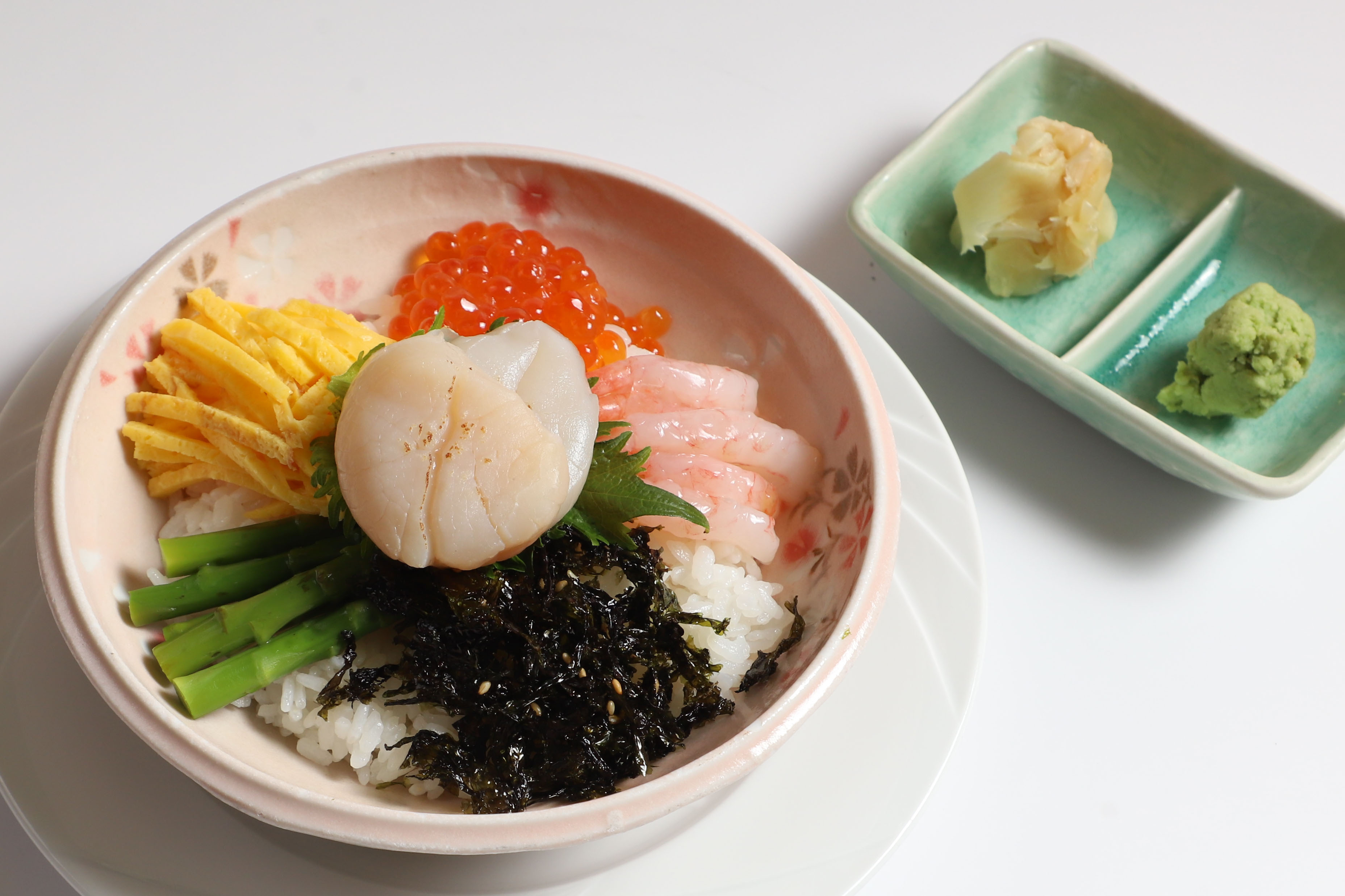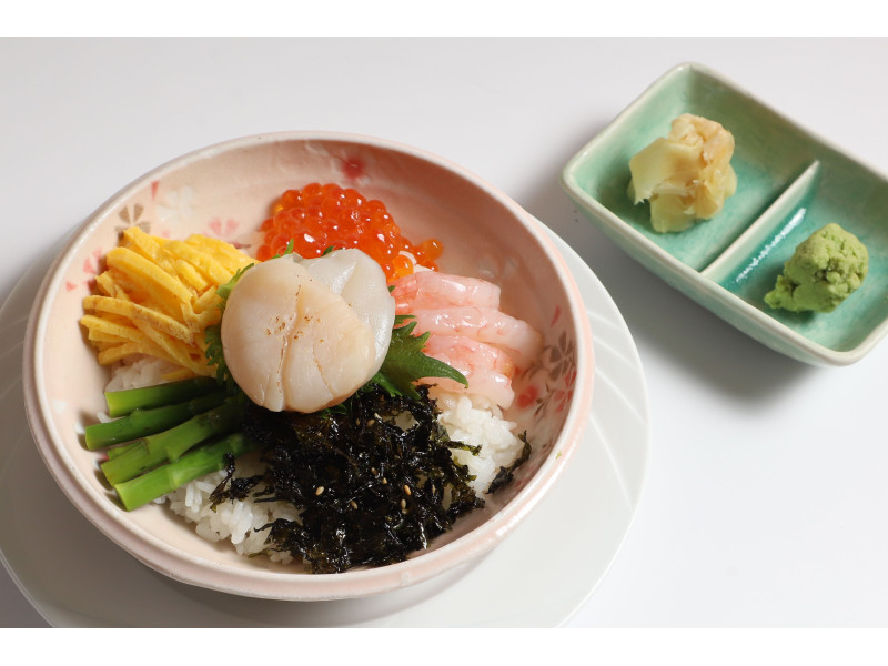 將北海道干貝鋪陳於清爽醋飯上,搭配多樣海味配料,干貝鮮甜細嫩、米香回甘,既可飽腹又輕盈無負擔